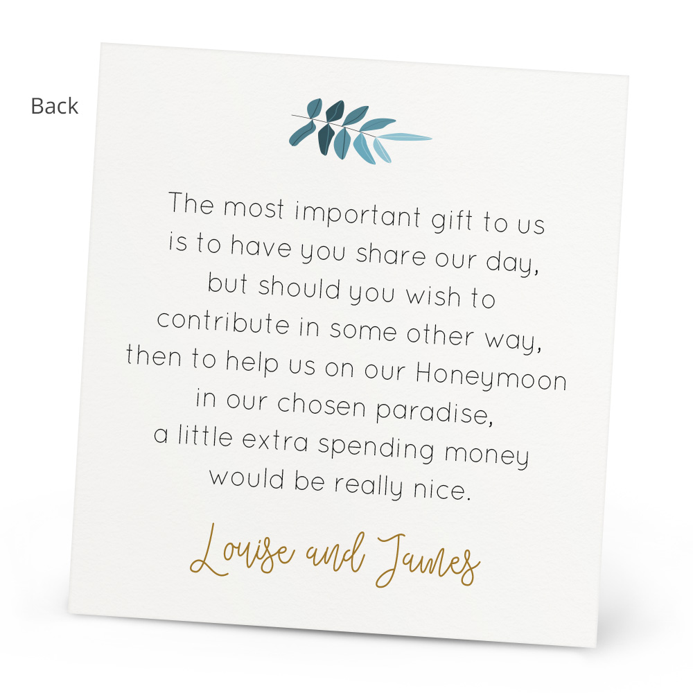 The Amelia Honeymoon Wish Card is a lovely extra to go with your invitations if you’re thinking of asking your guests for money as a contribution to your honeymoon. You can personalise it with your names and choose your colour to fit your theme. The Honeymoon Wish card can also be customised, just let us know if you’d like a different poem written on! Every Honeymoon Wish Card is double sided and printed onto 300gsm card.