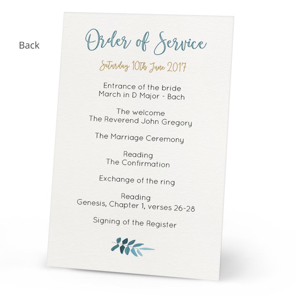 This Amelia Order of Service Card is a simple yet elegant design printed onto textured 300gsm card. The card is fully personalised with your wedding’s ceremony times. We strive to have the highest levels of customer satisfaction by working closely with you to ensure that every little detail is perfect!
