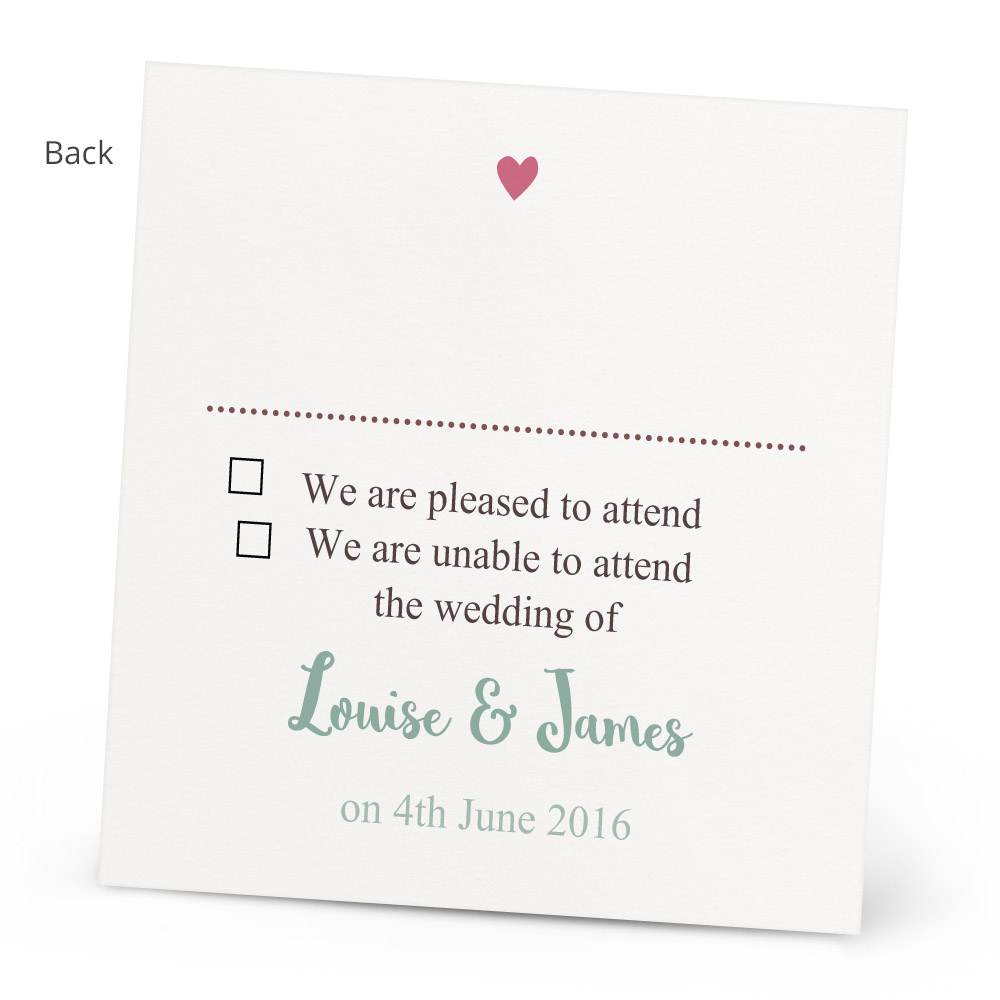 The wedding is planned and booked! This beautiful Chloe RSVP card will let your guests give you the feedback of attending your wedding. Personalise the message on the front and inside and choose your colour to give a message tailored to your wedding!