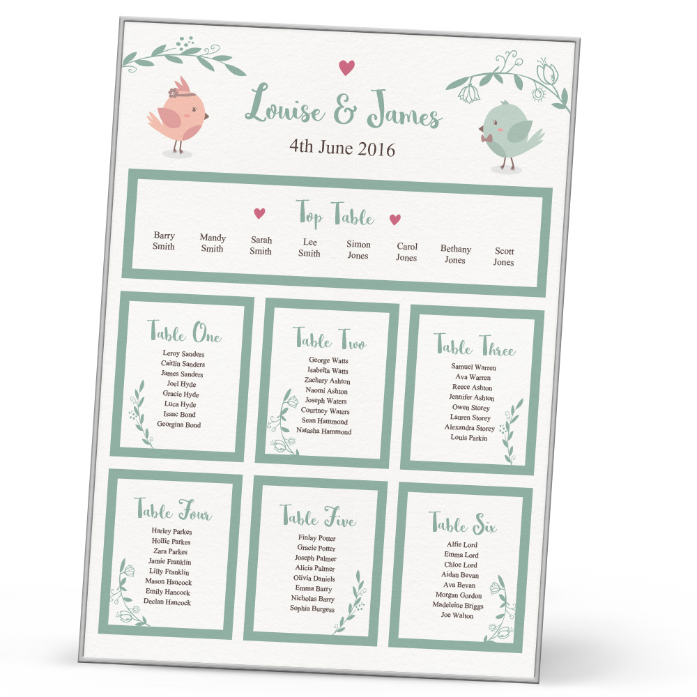 Match your table plan to the rest of your wedding stationery with the Chloe table plan. With the beautiful in love birds and delicate branches, this is perfect for showing where your wedding guests are seated. Pick a size from A3, A2 and A1 depending on your preference, all mounted onto a frame for a truly quality look and feel.