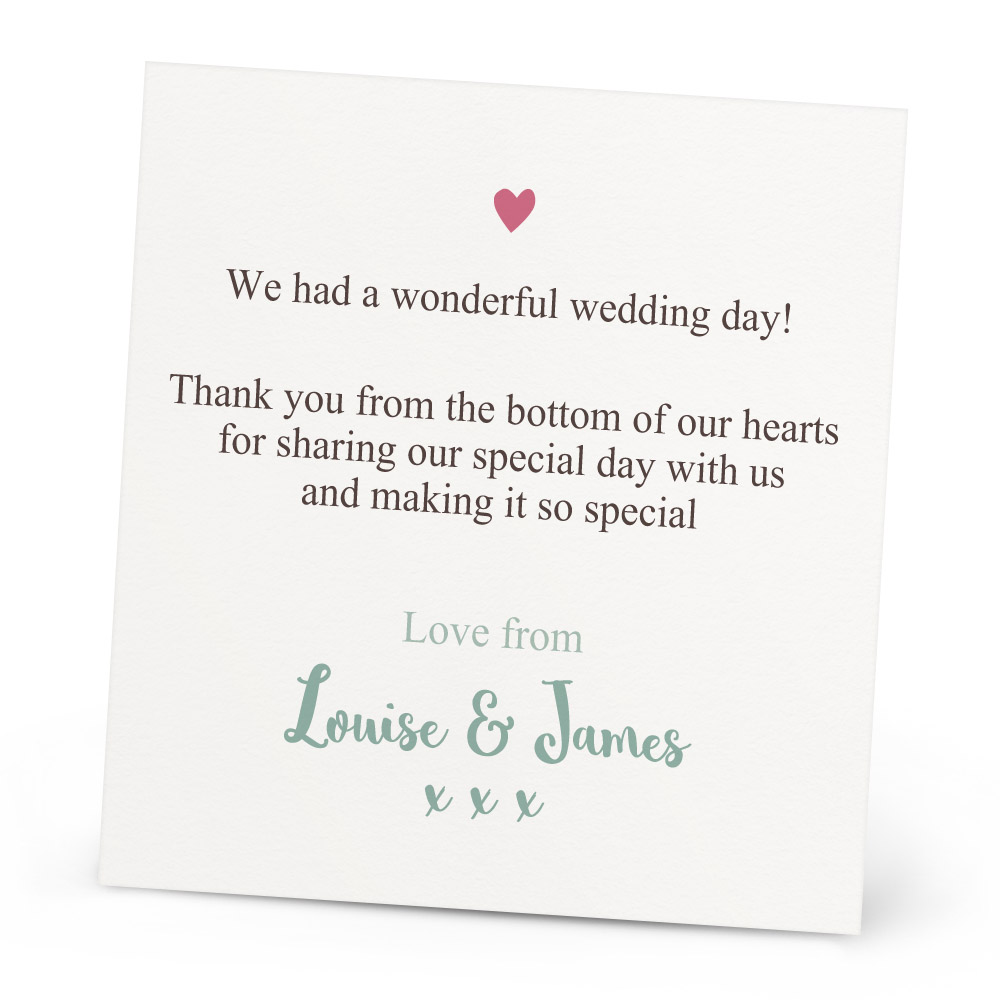 The Chloe Thank You Card is a lovely way to give a personalised thank you to your wedding guests. Personalise the text inside and choose a colour to match your wedding day, for a lovely way to say thank you!