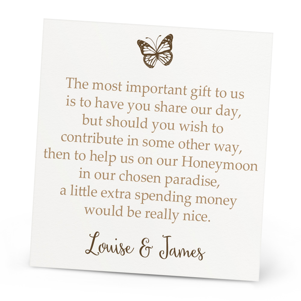 The Delilah Honeymoon Wish Card is a lovely extra to go with your invitations if you’re thinking of asking your guests for money as a contribution to your honeymoon. You can personalise it with your names and choose your colour to fit your theme. The Honeymoon Wish card can also be customised, just let us know if you’d like a different poem written on! Every Honeymoon Wish Card is double sided and printed onto 300gsm card.