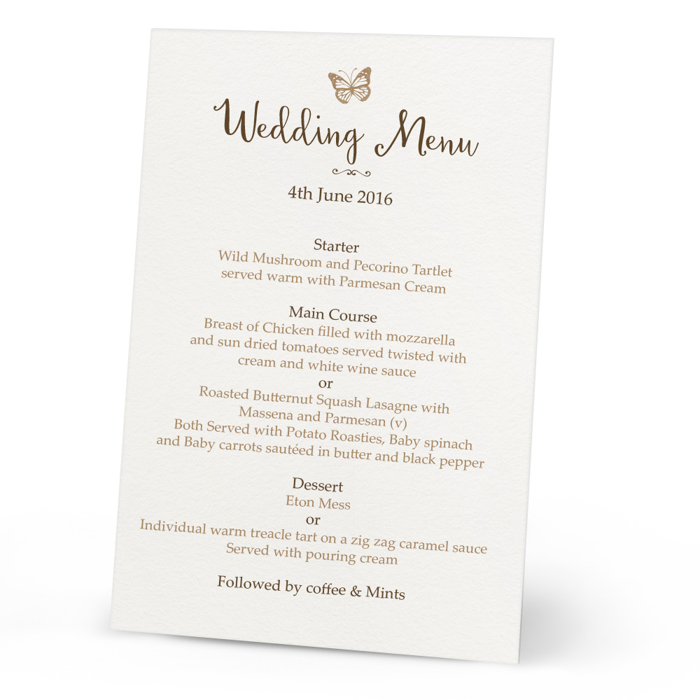 Let your wedding guests have a choice of meal with style with the Delilah Menu’s. Personalise the colour to suit your wedding meal, and also buy these with matching Table Plan, and Place Cards for a truly personalised and matching style.
