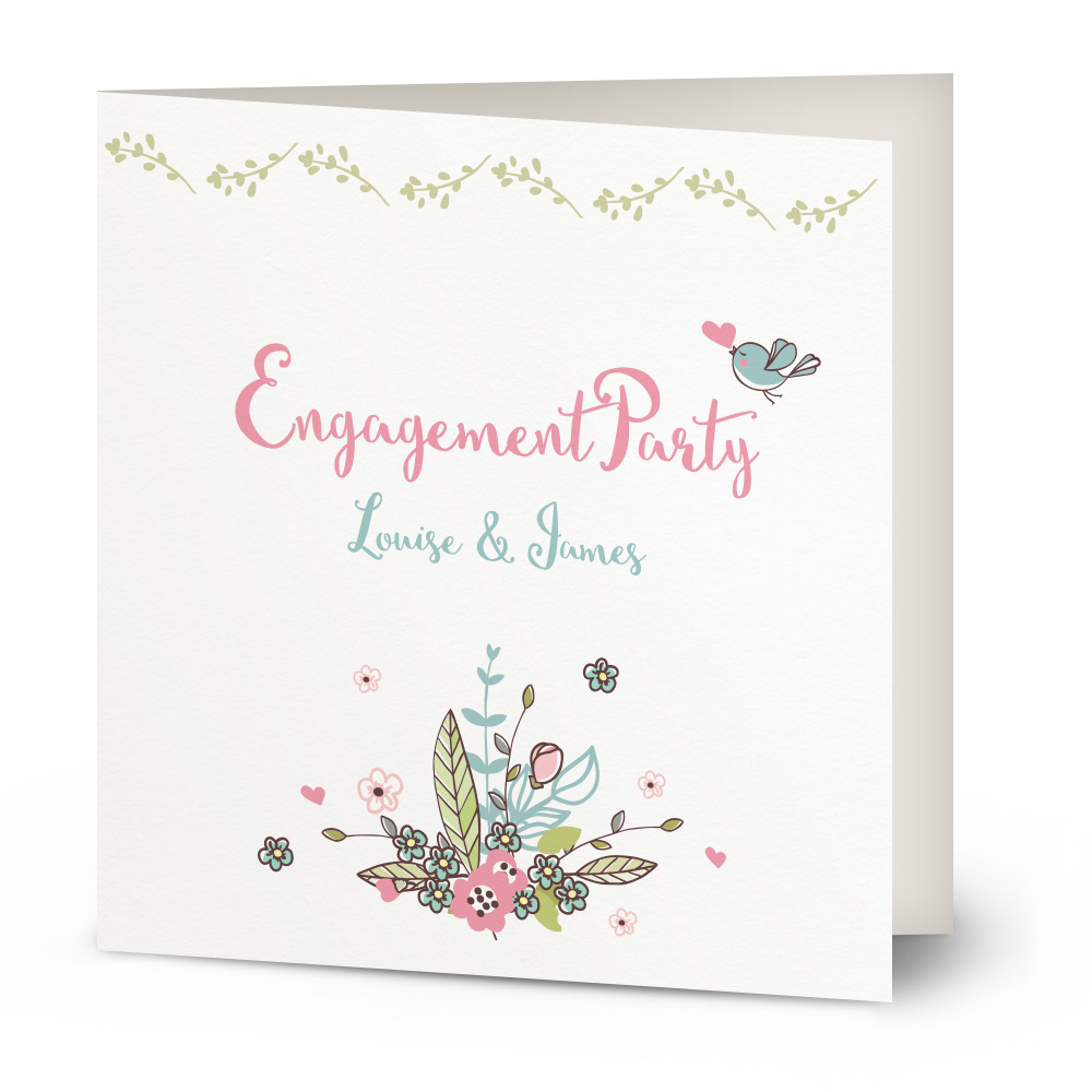 Celebrate your engagement in style with these personalised engagement party invitations. With a beautiful bouquet of flowers, and flowing petals, the Ella engagement party invitation will give your party a lovely summer style!