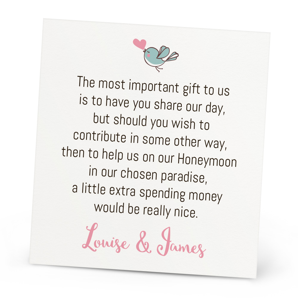 The Ella Honeymoon Wish Card is a lovely extra to go with your invitations if you’re thinking of asking your guests for money as a contribution to your honeymoon. You can personalise it with your names and choose your colour to fit your theme. The Honeymoon Wish card can also be customised, just let us know if you’d like a different poem written on! Every Honeymoon Wish Card is double sided and printed onto 300gsm card.
