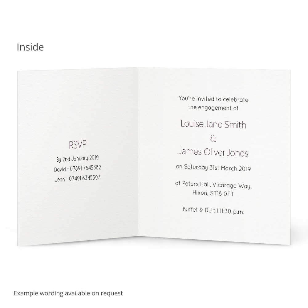 Let your friends and family know about your engagement party with the Evelyn Engagement Card. Write your own message inside the card, plus choose your colour to make these cards unique to your celebrations. Textured envelopes are included, plus every invitation is printed onto thick 300gsm textured card.