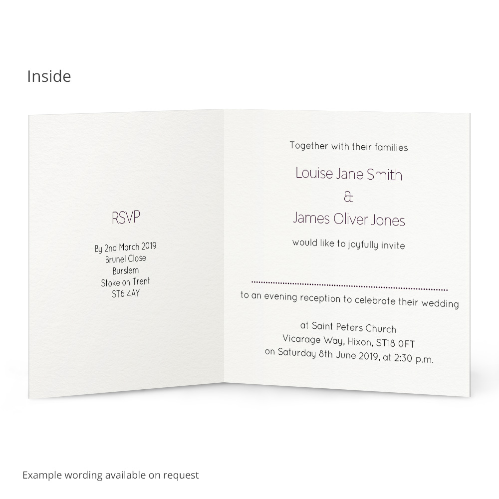 With the Evelyn Evening Invitation, you can fully personalise the text inside and outside of the card with a colour of your choice, and a tailored message for your wedding guests. This evening invitation is printed onto textured 300gsm card, giving these invitations a lovely feel. Matching envelopes are included with these evening invitations, plus – we also have a complete range of stationery in the Evelyn collection to make the theme shine through your wedding!
