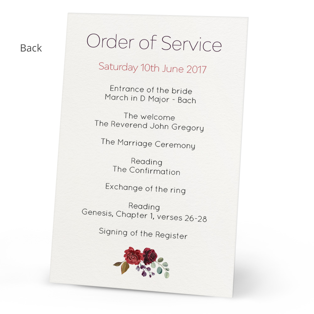 This Evelyn Order of Service Card is a simple yet elegant design printed onto textured 300gsm card. The card is fully personalised with your wedding’s ceremony times. We strive to have the highest levels of customer satisfaction by working closely with you to ensure that every little detail is perfect!