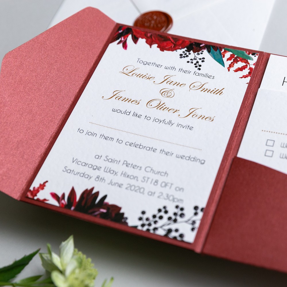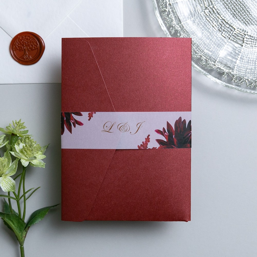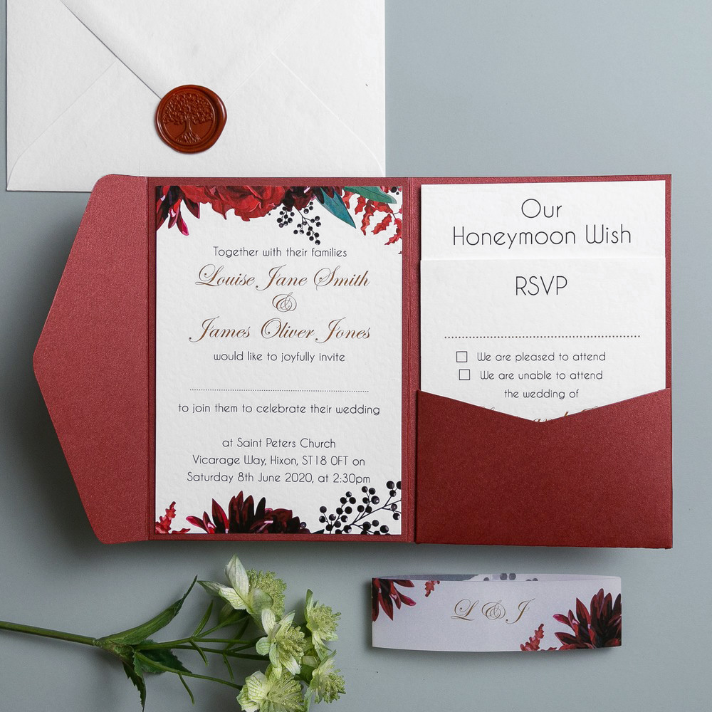 The Georgia Pocketfold Wedding Invitation is tailored to your wedding by personalising all the text to your choice to make these completely unique for your wedding guests. Inside the invitation is 2 or 3 cards – you can choose from RSVP, Information Card, or Honeymoon Wish. Each Pocketfold is tailored to the colour of your choice, and comes with a belly band to hold everything together. All our Pocketfold Invitations come with textured white envelopes.