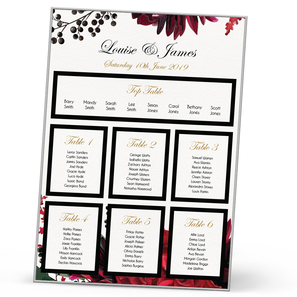 The Georgia Table Plan is a beautiful way to show your guests where they’re seated at your wedding. The table plan is created with the layout of your choice, plus there’s a range of sizes available – A3, A2, A1. All are mounted into an elegant frame too. We can accommodate if you have a different number of tables, just let us know and we will do the rest!