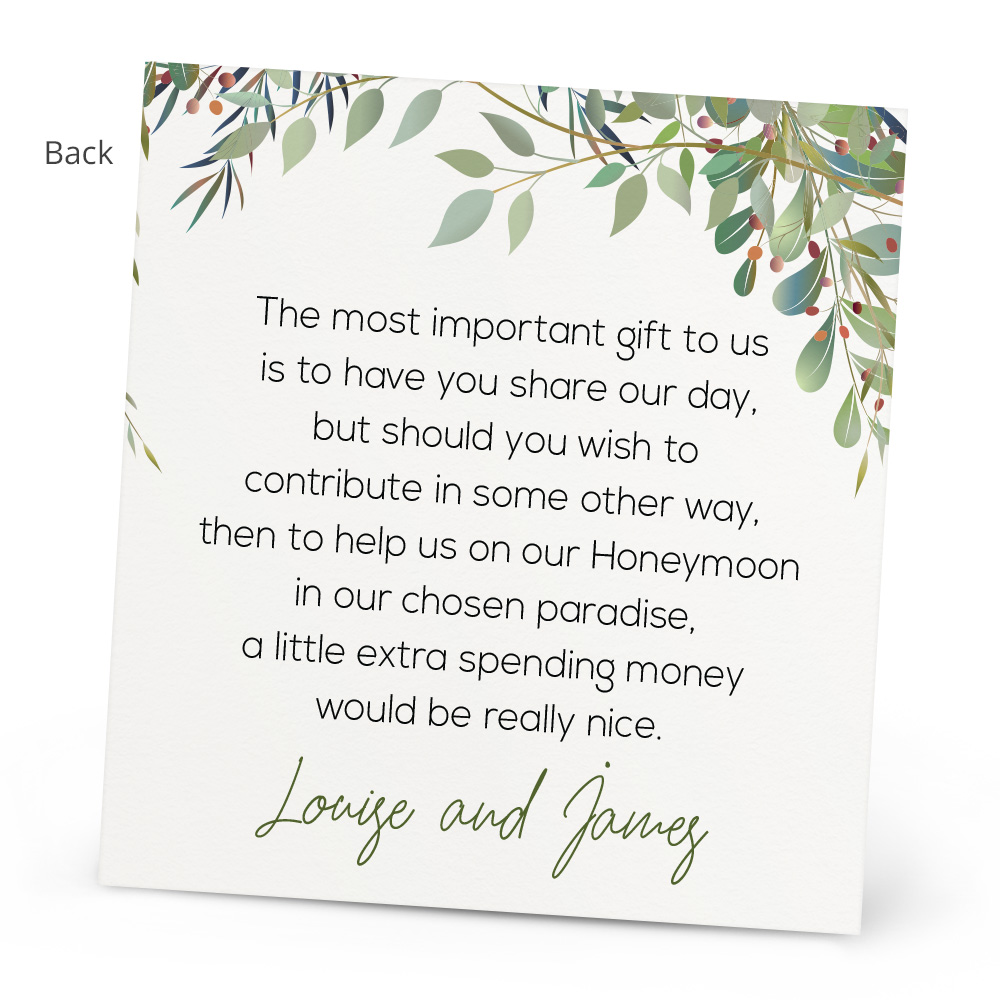 The Grace Honeymoon Wish Card is a lovely extra to go with your invitations if you’re thinking of asking your guests for money as a contribution to your honeymoon. You can personalise it with your names and choose your colour to fit your theme. The Honeymoon Wish card can also be customised, just let us know if you’d like a different poem written on! Every Honeymoon Wish Card is double sided and printed onto 300gsm card.