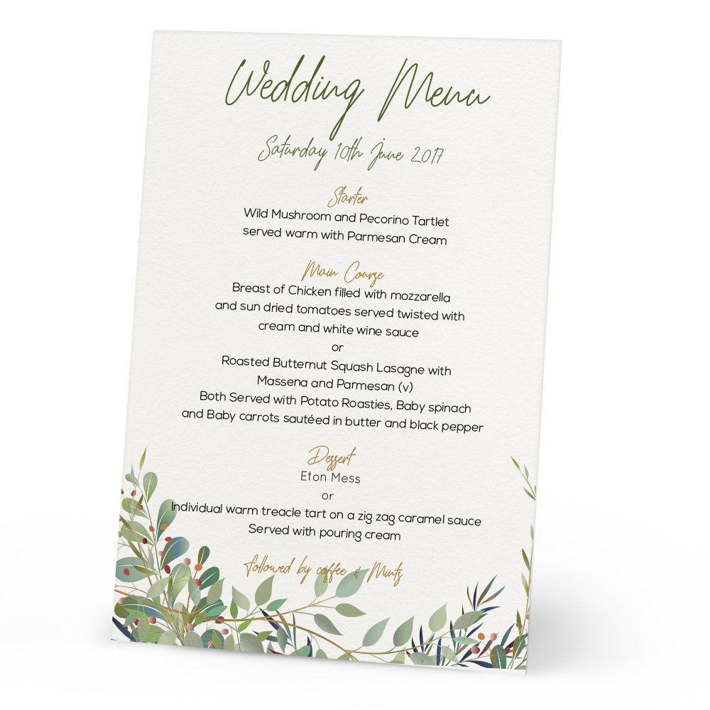 The Grace collection has a lovely elegant menu for your tables at your wedding meal. Featuring a fully customised menu for your wedding, the Menu is printed onto thick 300gsm textured card, for a quality feel. Also in the collection is matching Place Cards and Table Plan for the beautiful Grace style to flow though your wedding!