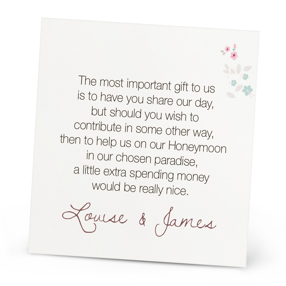 The Hattie Honeymoon Wish Card is a lovely extra to go with your invitations if you’re thinking of asking your guests for money as a contribution to your honeymoon. You can personalise it with your names and choose your colour to fit your theme. The Honeymoon Wish card can also be customised, just let us know if you’d like a different poem written on! Every Honeymoon Wish Card is double sided and printed onto 300gsm card.