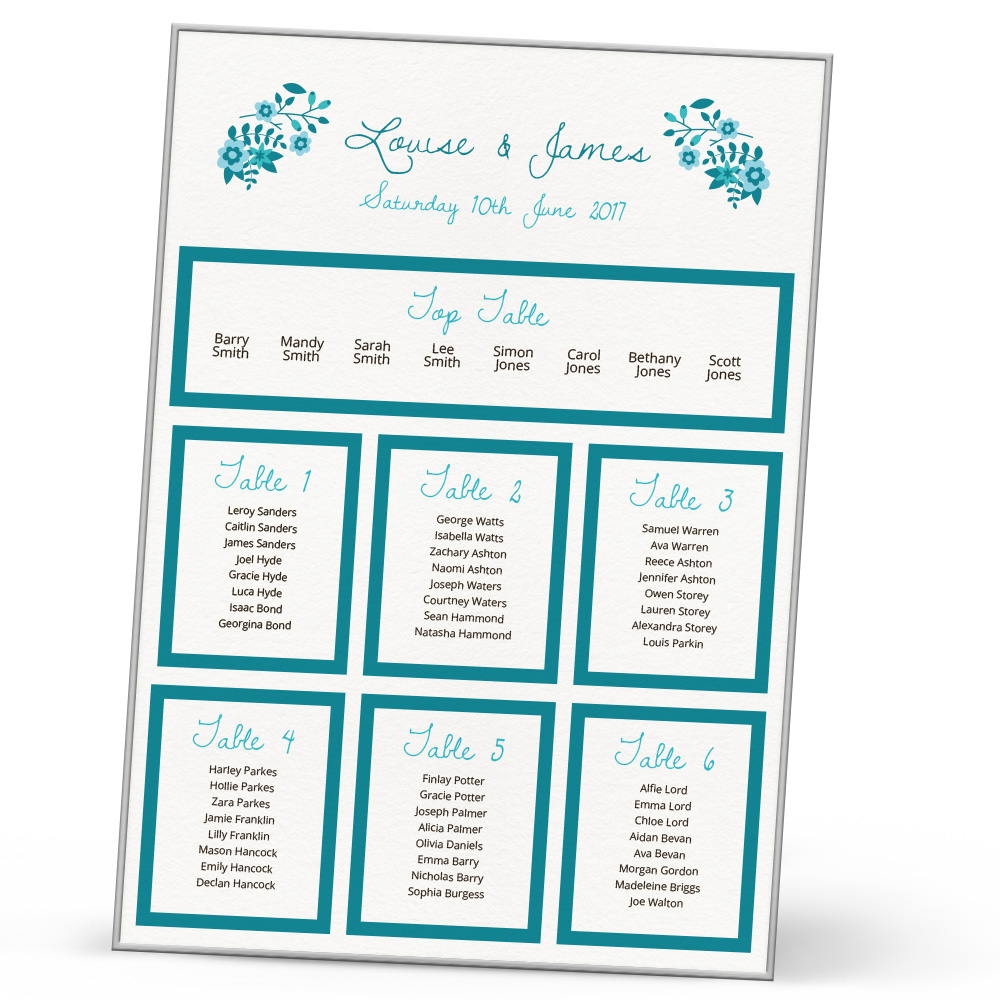 The Imogen Table Plan is a beautiful way to show your guests where they’re seated at your wedding. The table plan is created with the tables of your choice, plus there’s a range of sizes available – A3, A2, A1. All are mounted into an elegant frame too. We can accommodate if you have a different number of tables, just let us know and we will do the rest!