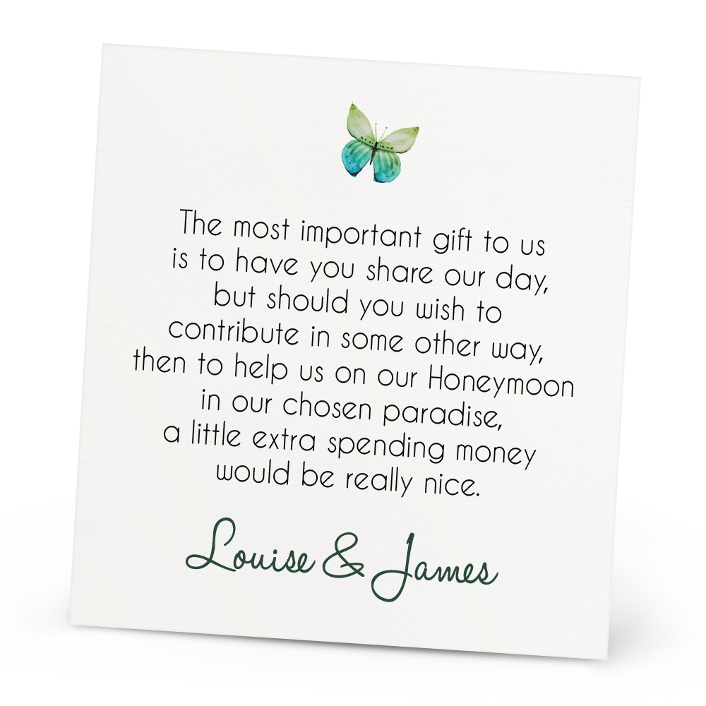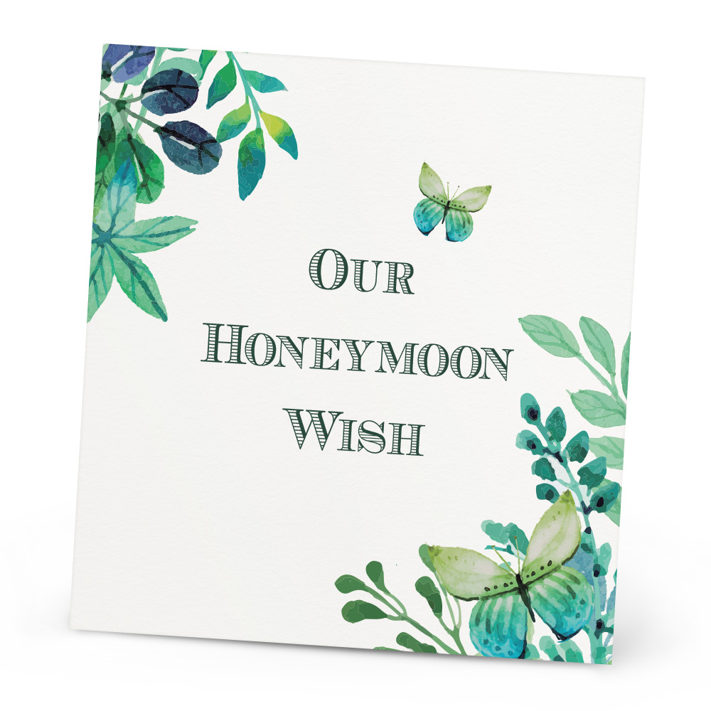 The Jasmine Honeymoon Wish Card is a lovely extra to go with your invitations if you’re thinking of asking your guests for money as a contribution to your honeymoon. You can personalise it with your names and choose your colour to fit your theme. The Honeymoon Wish card can also be customised, just let us know if you’d like a different poem written on! Every Honeymoon Wish Card is double sided and printed onto 300gsm card.