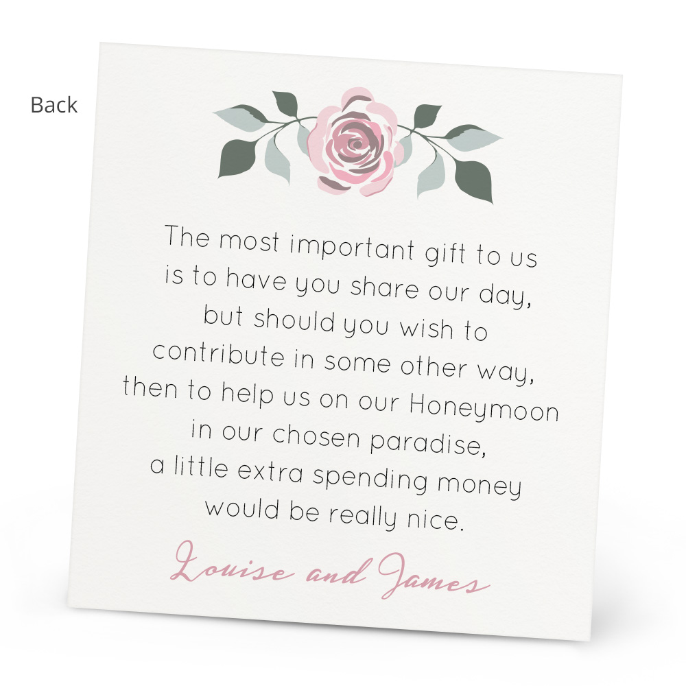 The Juliette Honeymoon Wish Card is a lovely extra to go with your invitations if you’re thinking of asking your guests for money as a contribution to your honeymoon. You can personalise it with your names and choose your colour to fit your theme. The Honeymoon Wish card can also be customised, just let us know if you’d like a different poem written on! Every Honeymoon Wish Card is double sided and printed onto 300gsm card.