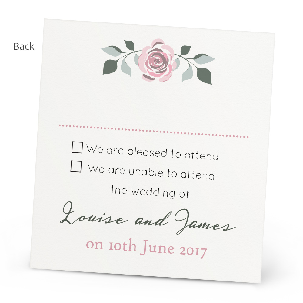 The Juliette RSVP Card lets your wedding guests respond to you about attending your wedding day. You can fully personalise the text to give a tailored feel for your guests. The card is printed onto thick 300gsm textured card, and has matching Wedding Invitations and Evening Invitations to create a beautiful flowing theme throughout your Wedding. The RSVP card also comes with an envelope for your guests to reply to you.
