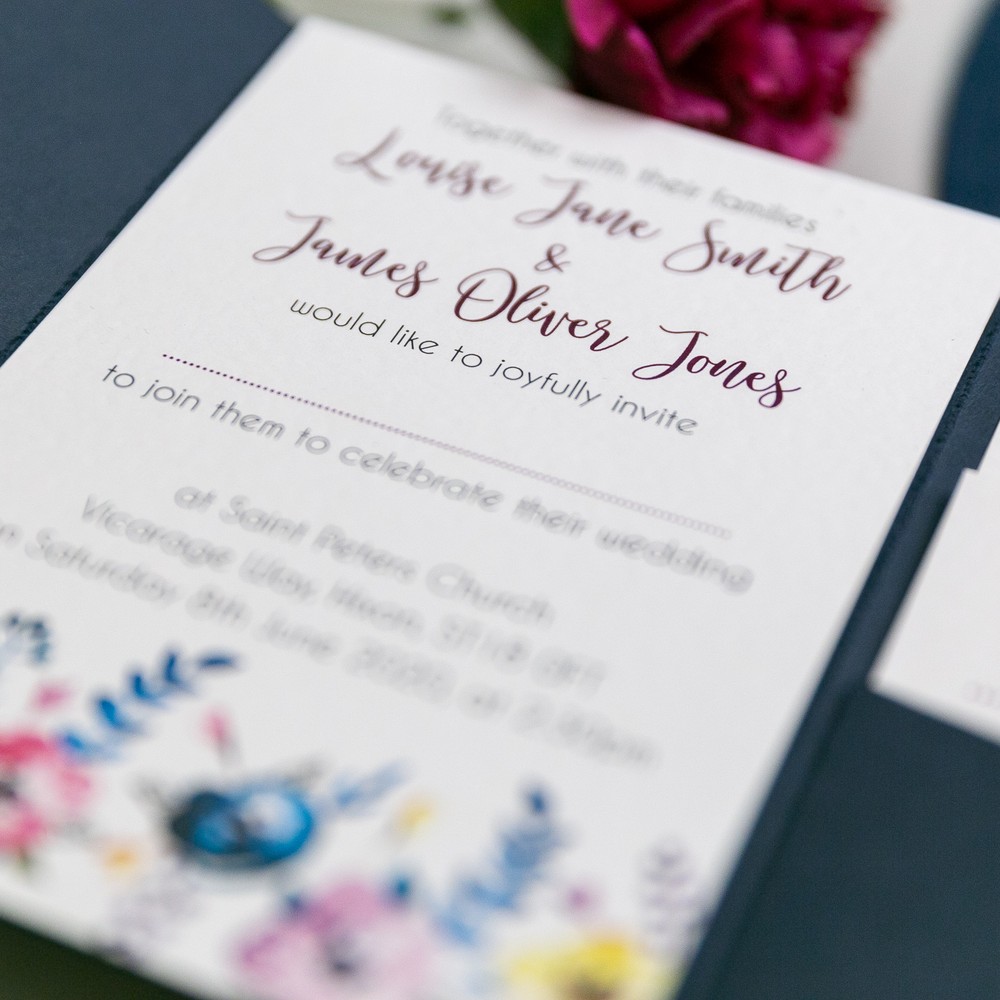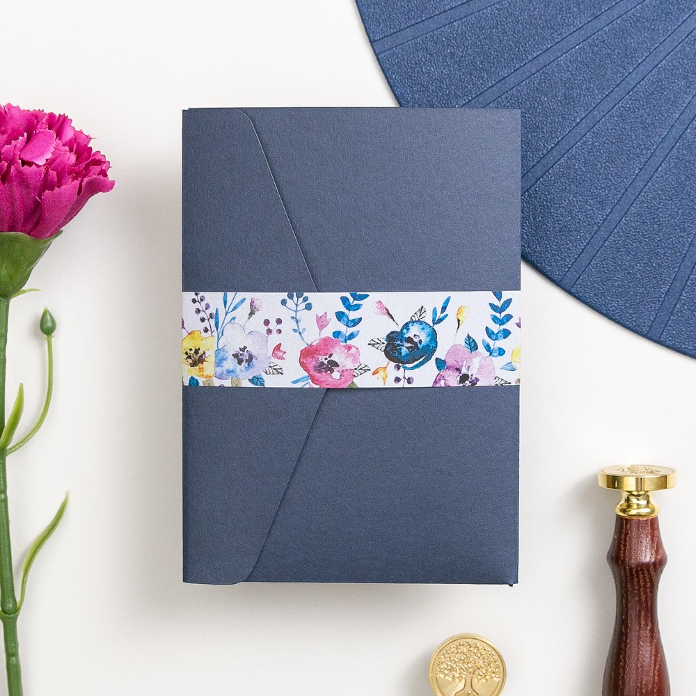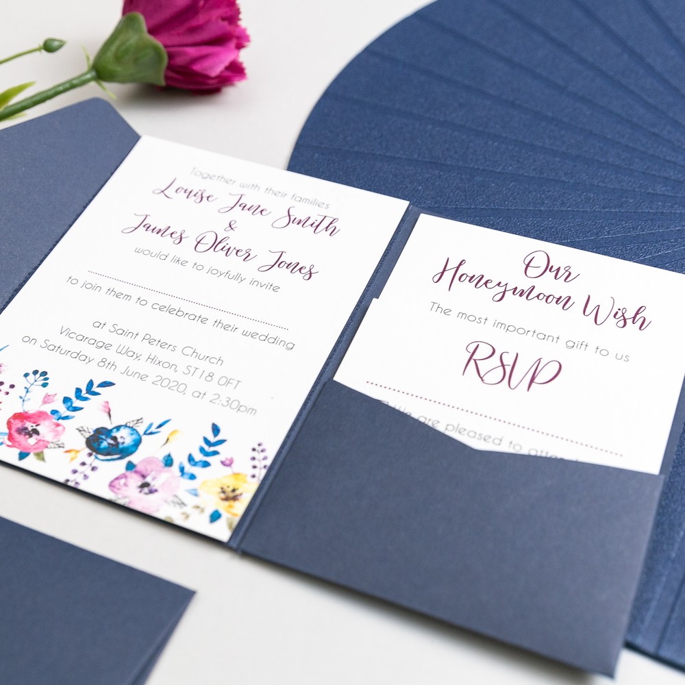 The Leah Pocketfold Wedding Invitation is tailored to your wedding by personalising all the text to your choice to make these completely unique for your wedding guests. Inside the invitation is 2 or 3 cards – you can choose from RSVP, Information Card, or Honeymoon Wish. Each Pocketfold is tailored to the colour of your choice, and comes with a belly band to hold everything together. All our Pocketfold Invitations come with textured white envelopes.