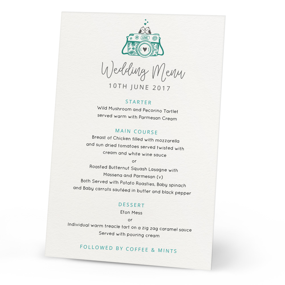 The Louise Wedding Menu is a lovely elegant design for your tables at your wedding meal. Have your menu printed onto the cards, and choose the colour to match your wedding theme. Every Menu is printed onto thick 300gsm textured card, for a lovely quality feel when holding the menu. The Louise collection also has matching Table Plan and Place Cards for a beautiful style to flow though your wedding!