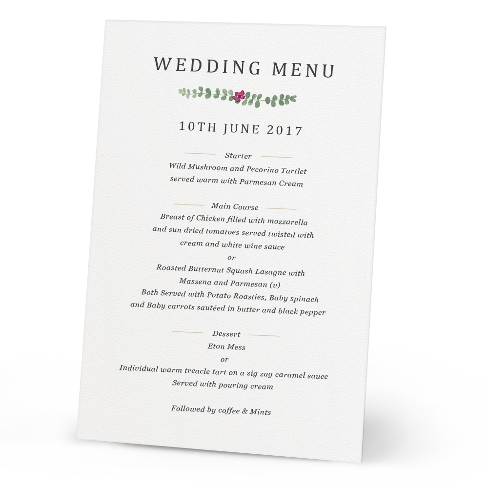 The Madeline wedding menu is a lovely item for your tables at your wedding meal. Add a personalised menu tailored to your wedding. The Menu is printed onto thick 300gsm textured card, for quality you can feel.