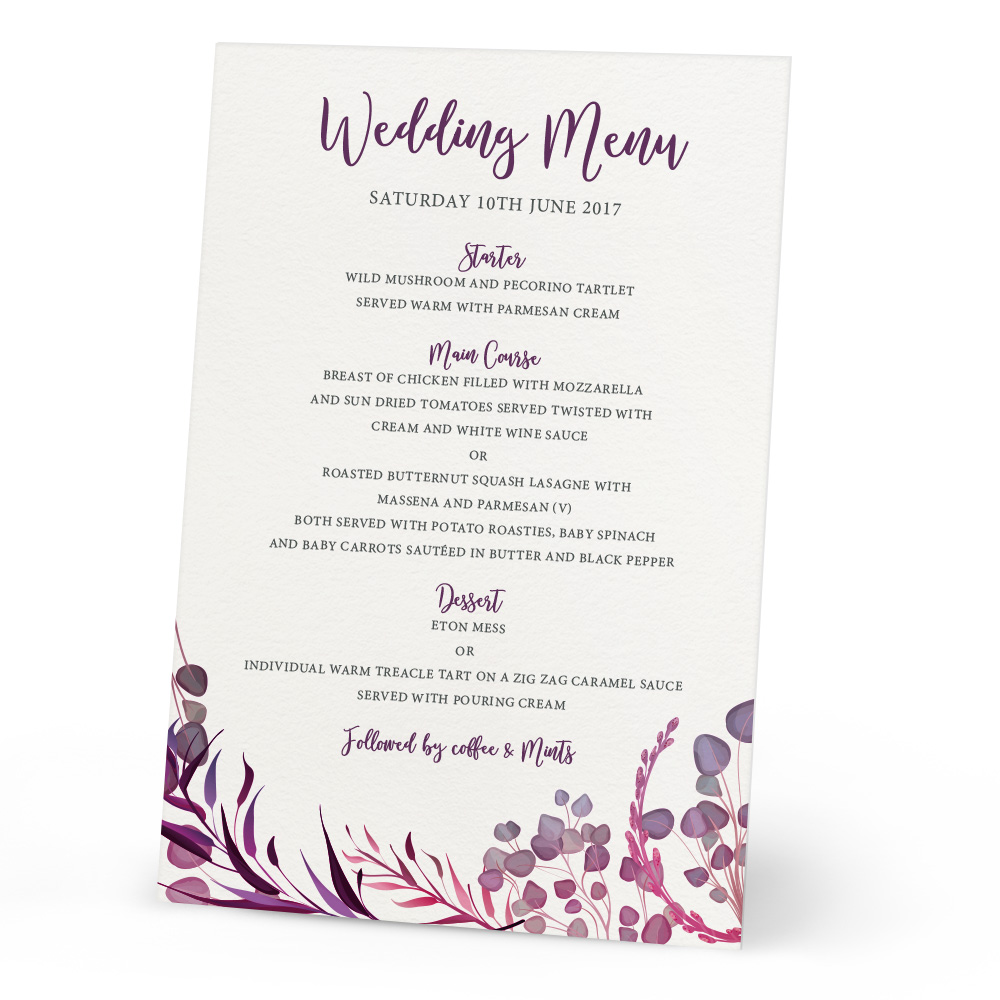 The Maya collection has a lovely elegant menu for your tables at your wedding meal. Featuring a fully customised menu for your wedding, the Menu is printed onto thick 300gsm textured card, for a quality feel. Also in the collection is matching Place Cards and Table Plan for the beautiful Georgia style to flow though your wedding!