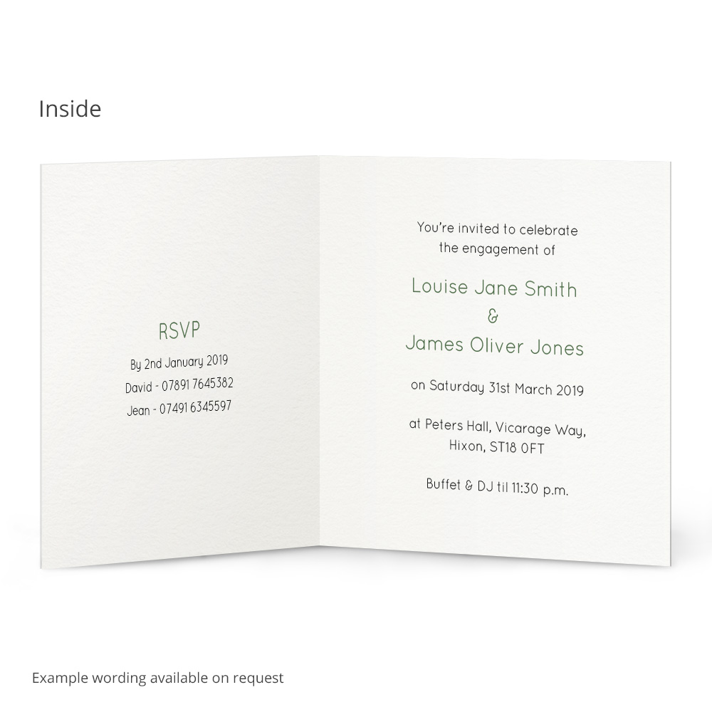 Let your friends and family know about your engagement party with the Megan Engagement Card. Write your own message inside the card, plus choose your colour to make these cards unique to your celebrations. Textured envelopes are included, plus every invitation is printed onto thick 300gsm textured card.