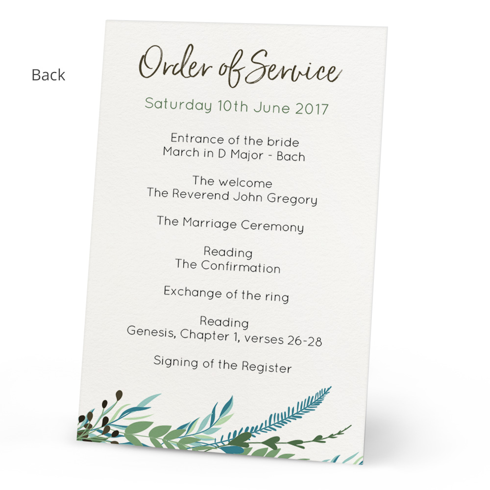 This Megan Order of Service Card is a simple yet elegant design printed onto textured 300gsm card. The card is fully personalised with your wedding’s ceremony times. We strive to have the highest levels of customer satisfaction by working closely with you to ensure that every little detail is perfect!