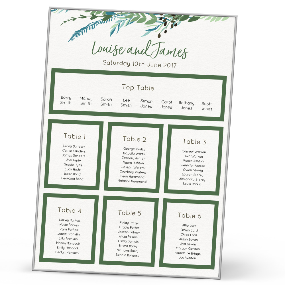 The Megan Table Plan is a beautiful way to show your guests where they’re seated at your wedding. The table plan is created with the layout of your choice, plus there’s a range of sizes available – A3, A2, A1. All are mounted into an elegant frame too. We can accommodate if you have a different number of tables, just let us know and we will do the rest!