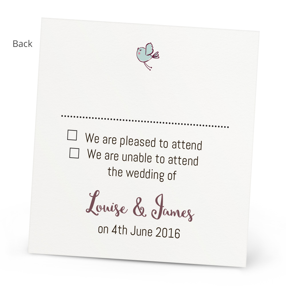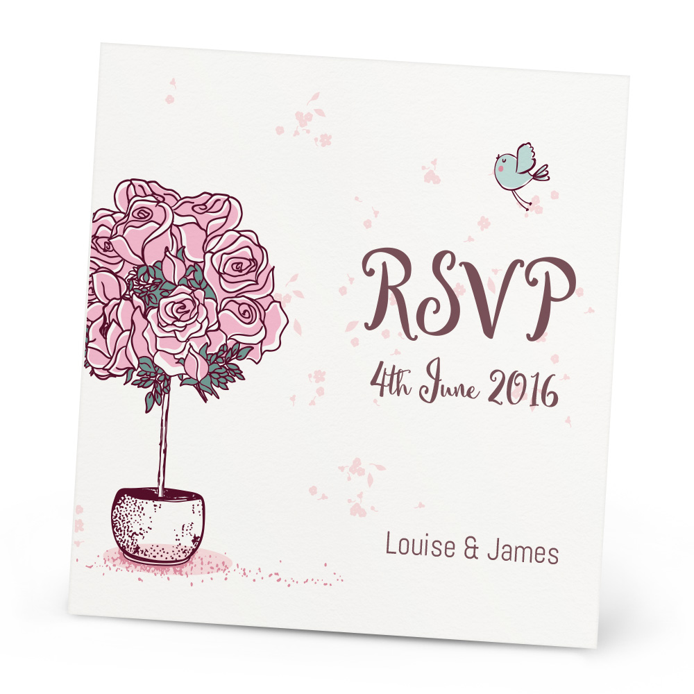 These Personalised RSVP cards are the ideal way to get the feedback from your guests whether they’re going to attend. The lovely topiary tree design with it’s roses and petals matches other stationery items to continue your theme throughout your wedding.