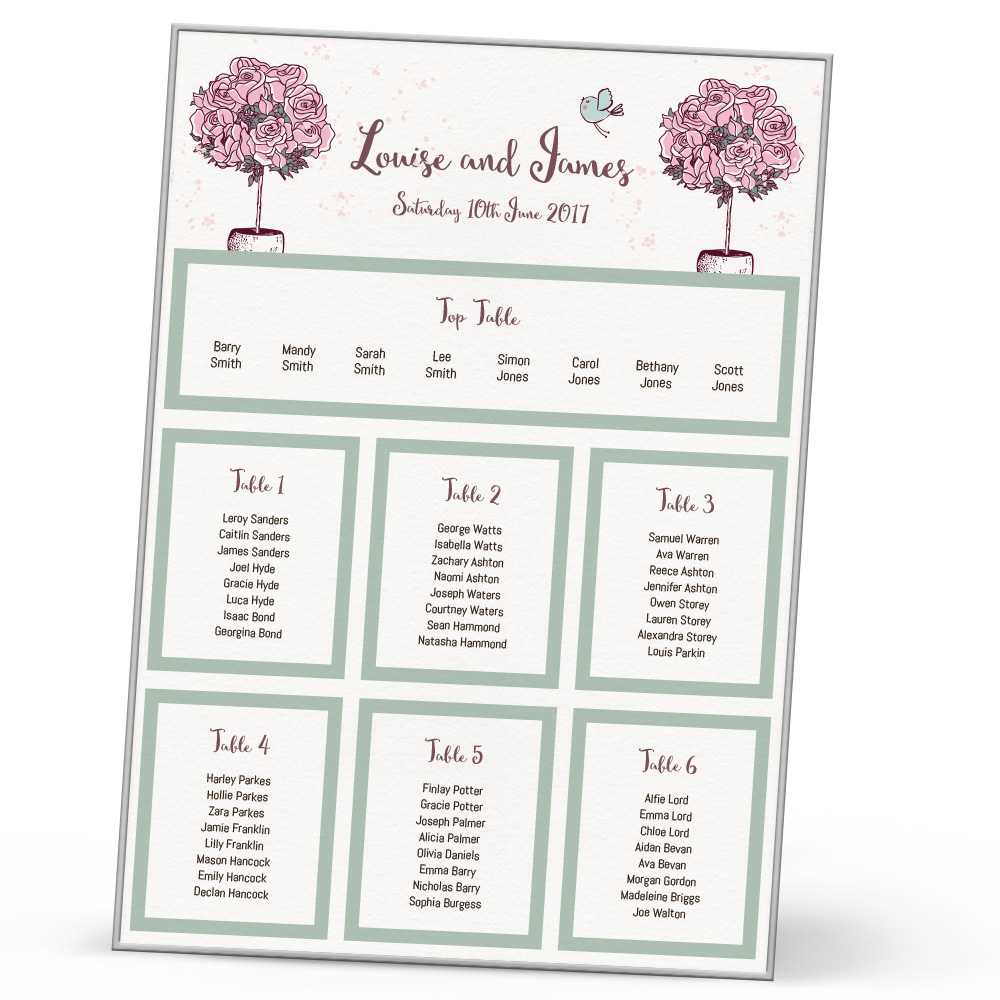 Let your guests know where they’re sitting with the beautiful Olive table plan. Choose which size your want – A1, A2 or A3 depending on your preference. Customise the colour to suit your theme, and this will make your meal time one to remember. There’s matching stationery items such as place cards, and menus to let the beautiful Topiary theme run throughout your wedding!