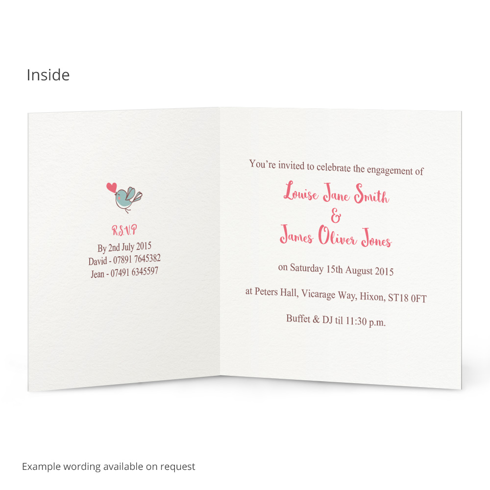 Let your guests celebrate your engagement with these Penny engagement party invitations. The beautiful design and dainty birds carrying the heart and surrounding tree are perfect to match you in one of the most exciting moments of your life. Personalise the colour and customise the text to give a truly personal feel to your engagement party!