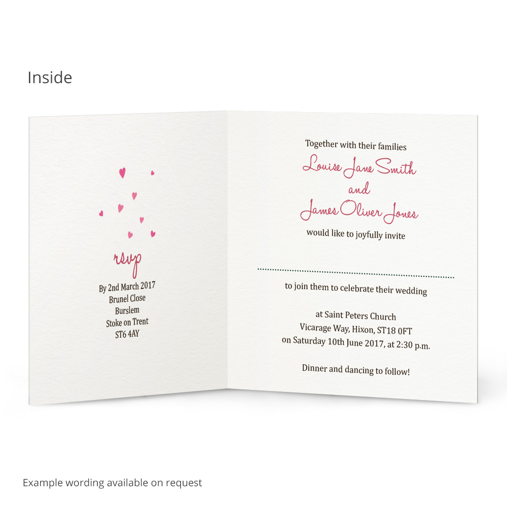 The Sadie wedding invitation is ideal for bringing the theme of your special day to life! You can personalise the colour of the invitation to match your wedding, and also change all the text to make these completely unique to your wedding. We offer a full range of matching wedding stationery to continue the beautiful theme throughout your wedding!