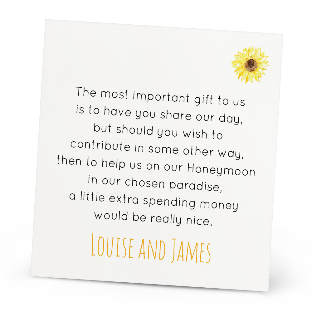 The Vanessa Honeymoon Wish Card is a lovely extra to go with your invitations if you’re thinking of asking your guests for money as a contribution to your honeymoon. You can personalise it with your names and choose your colour to fit your theme. The Honeymoon Wish card can also be customised, just let us know if you’d like a different poem written on! Every Honeymoon Wish Card is double sided and printed onto 300gsm card.