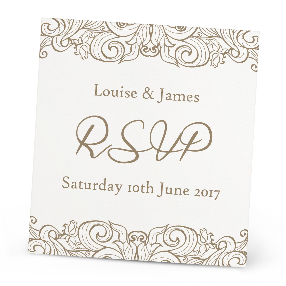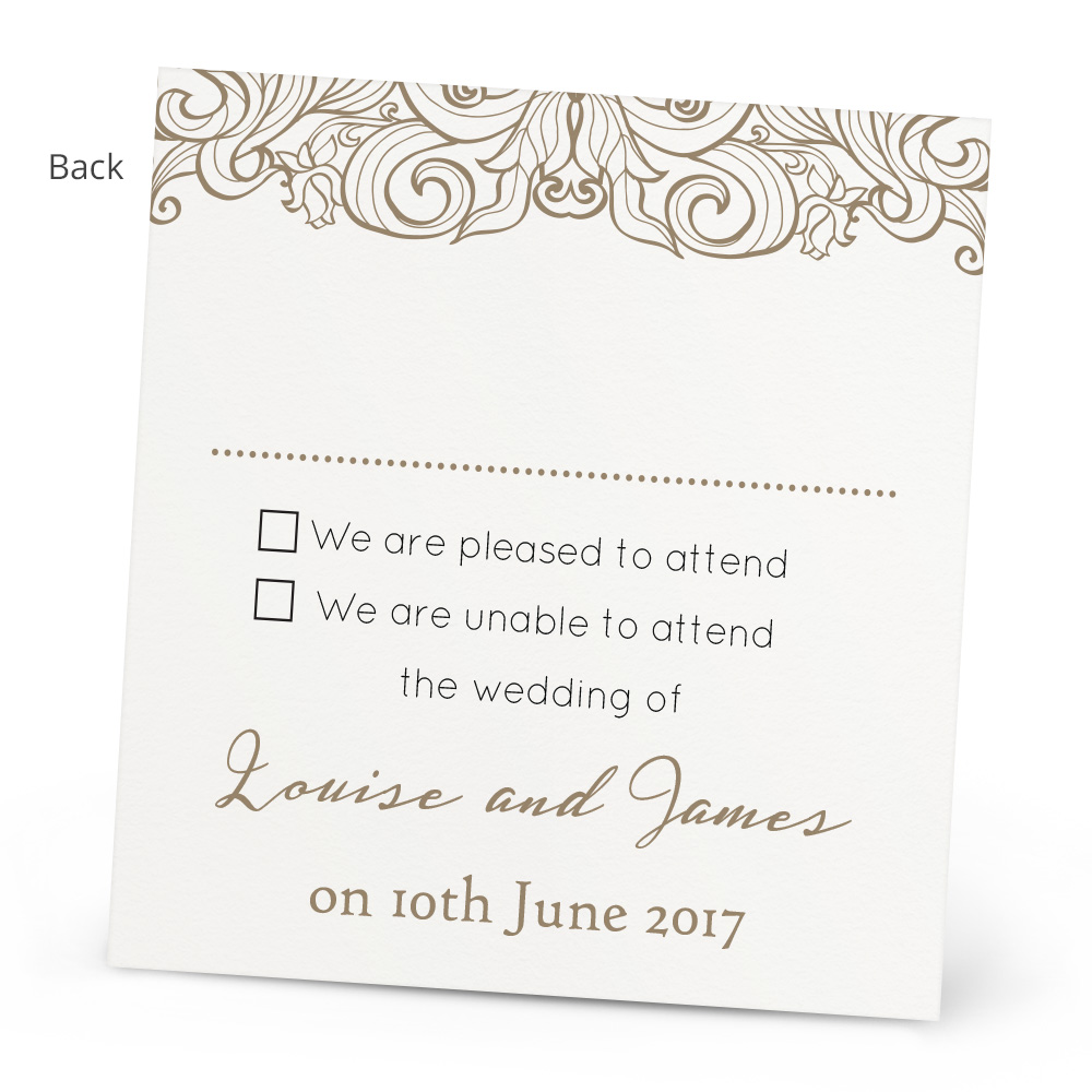 The Victoria RSVP Card lets your wedding guests respond to you about attending your wedding day. You can fully personalise the text to give a tailored feel for your guests. The card is printed onto beautiful 300gsm textured card, and has matching Wedding Invitations and Evening Invitations to create a beautiful flowing theme throughout your Wedding.