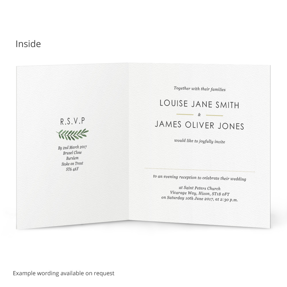 This Zoe Evening Invitation is a beautifully simple design, with elegant detailed bamboo shoots and leaves. You can fully personalise the text inside and outside of the card with a tailored message for your wedding guests. The invitation is printed onto thick textured 300gsm card, to give these invitations a premium look and feel. Matching envelopes are included with these evening invitations, furthermore – we also have a full range of matching stationery to make your wedding day beautiful!