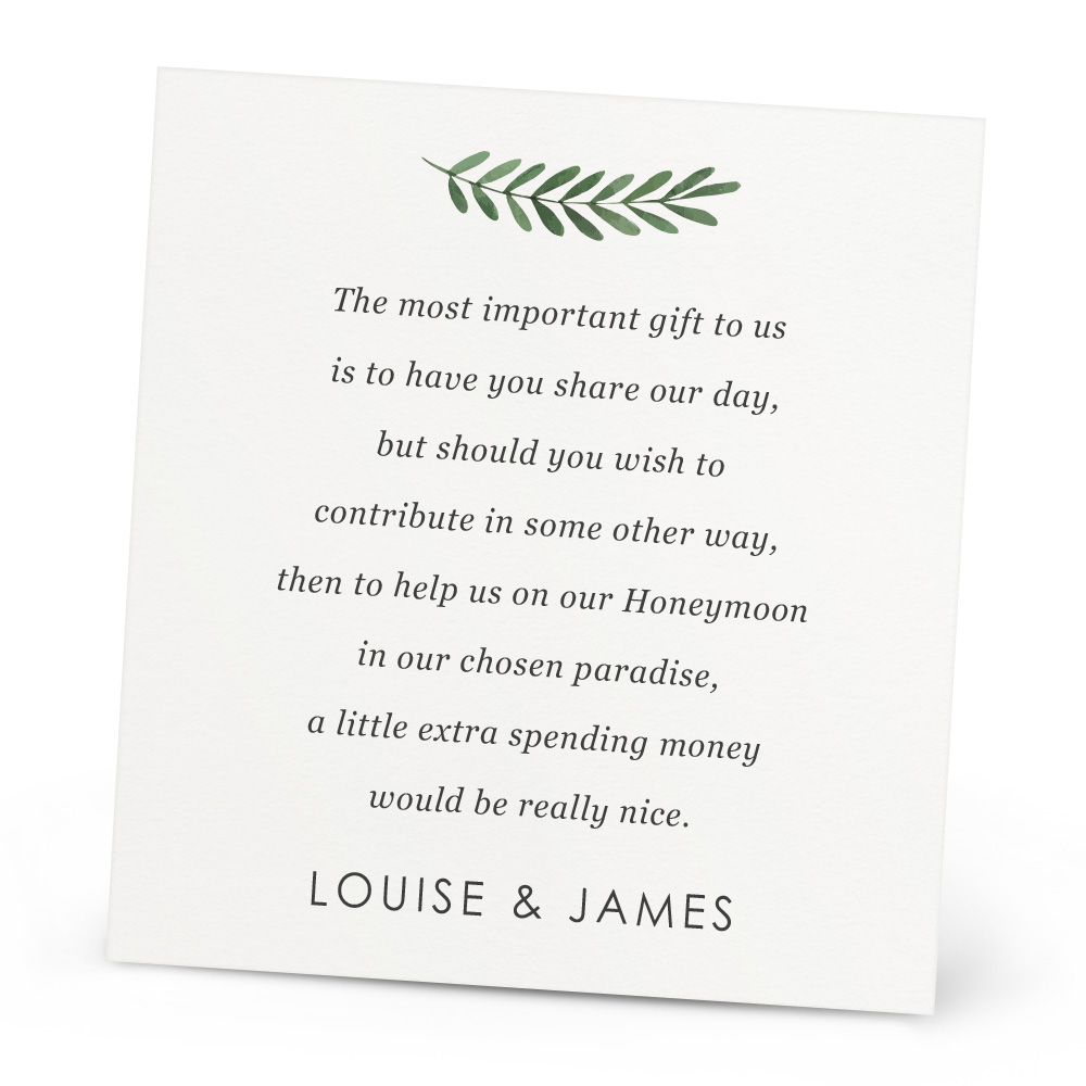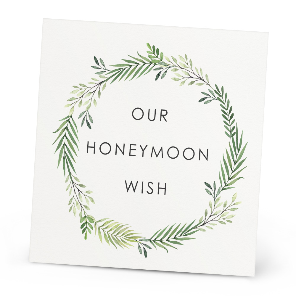 The Zoe Honeymoon Wish Card is a lovely extra to go with your invitations if you’re thinking of asking your guests for money as a contribution to your honeymoon. You can personalise it with your names and choose your colour to fit your theme. The Honeymoon Wish card can also be customised, just let us know if you’d like a different poem written on! Every Honeymoon Wish Card is double sided and printed onto 300gsm card.