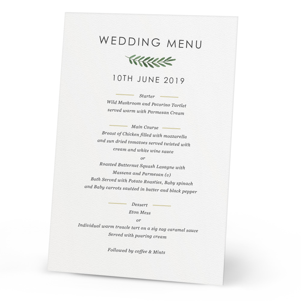 The Zoe collection has a lovely elegant menu for your tables at your wedding meal. Featuring a fully customised menu for your wedding, the Menu is printed onto thick 300gsm textured card, for a quality feel. Also in the collection is matching Place Cards and Table Plan for the beautiful Zoe style to flow though your wedding!